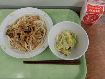 「五目冷やしうどん、ポリポリたっぷりサラダ、牛乳」です。