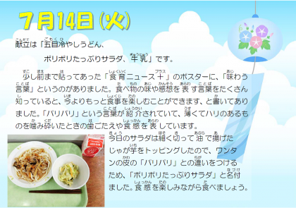 雨がしとしとと降り続け、気温が低めの日に冷やしうどんがあたってしまったなと残念に思っていましたが、教室は子どもたちの熱気で暖かく取り越し苦労だったようです。1年生は初めての冷たいうどんでしたが、上手に食べられたでしょうか。