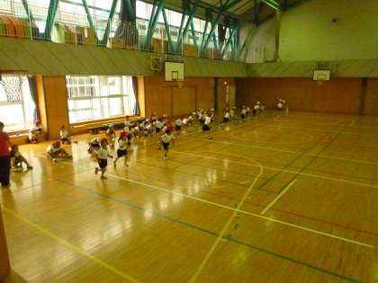 今年度から、スポーツテストは全学年実施をしています。6年生が1年生の、5年生が2年生の記録をとるため、お手伝いしてくれました。写真は、シャトルランの様子です。