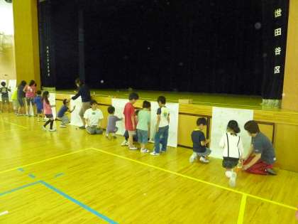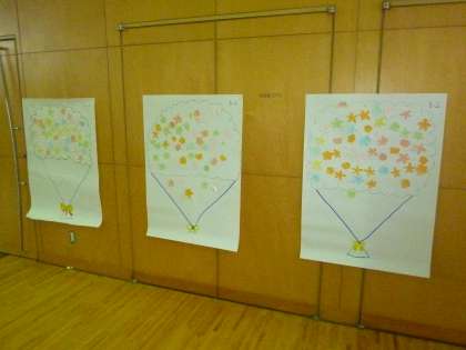 各クラスの前に立っている、集会委員の人とじゃんけんをして、勝つと花がもらえます。その花を、模造紙に貼り付けていくと、すてきな花束のできあがりです。