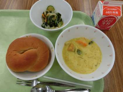 「黒砂糖パン、スプジュム、わかめサラダ、牛乳」です。