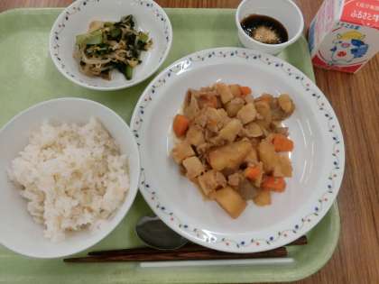 「麦ごはん、肉じゃが旨煮、菊花のおひたし、黒蜜寒天、牛乳」です。