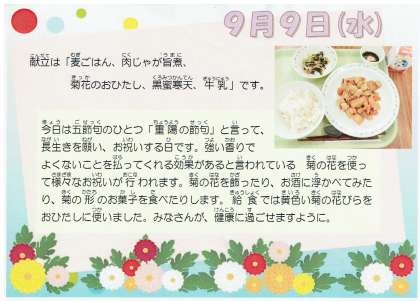 今日は重陽の節句をお祝いして、お浸しに菊の花びらを使いました。