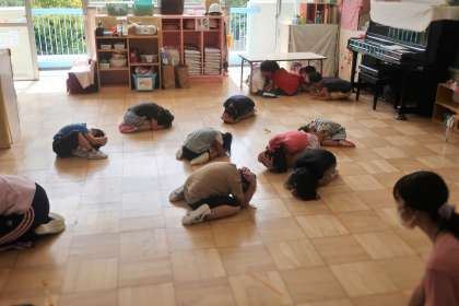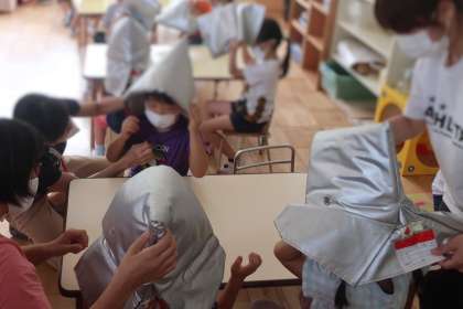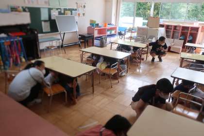 つくえの したに もぐったり、まんなかで あたまを まもったり しました。そのあと、ぼうさいずきんを かぶり、おむかえを まちました。