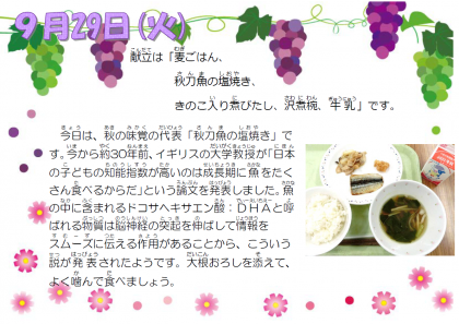 今日は秋のメニューです。秋刀魚にきのこ、ごはんがもりもり進みます。