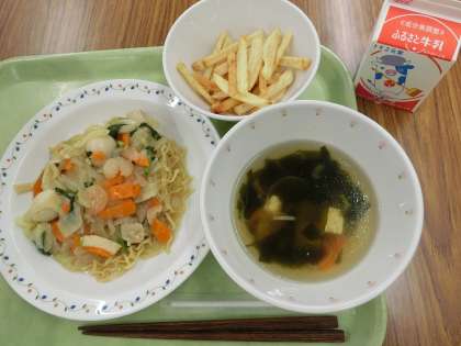 「五目あんかけそば、フライドポテト、わかめスープ、牛乳」です。