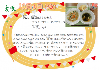 今日は、栄養黒板の緑の食品のところに食材カードが張り切れないくらいに野菜を使いました。そして、子どもたちに大人気のフライドポテトも大量でしたので、調理さんたちは、いつも以上に切りものに腕をふるってくださいました。