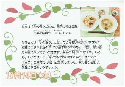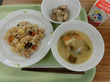 「秋の香りごはん、里芋のそぼろ煮、白菜の味噌汁、牛乳」です。