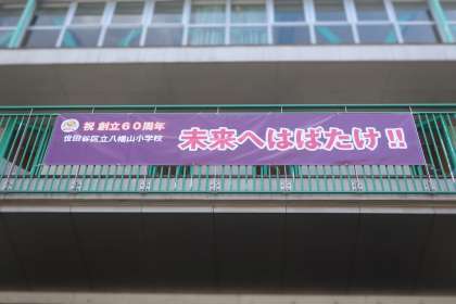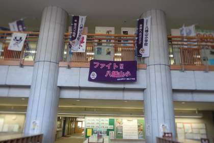 正門上には「未来へはばたけ‼」の横断幕が、中央玄関には「ファイト‼八幡山小」の応援幕があります。
