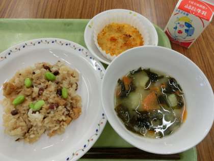 「豆まめおこわ、千草焼き、根菜味噌汁、牛乳」です。