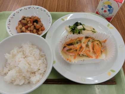 給食は、魚にお豆に、野菜の和食です。子どもたちに人気の「鮭の味噌マヨネーズ焼き」は、レシピを教えてくださいと言われる魚料理ナンバーワンです。残さず食べてくれるとうれしいです。