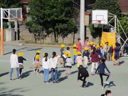 「ロクネンジャーをしよう」 10月に「学校を楽しくするには」を議題に学級会をしました。1年生から5年生の担当に分かれ、一緒に遊びをすることに決定、実践への計画を立てました。写真は、6年生が昼休みにロクネンジャーになり、1年生と「だるまさんがころんだ」で遊んでいるものです。やさしい6年生に遊んでもらって1年生はとても喜んでいました。