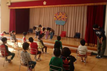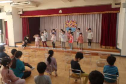 おたのしみの だしものは、ねんしょうの ももぐみさんと ばらぐみさんの うたでした。