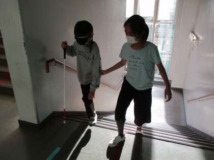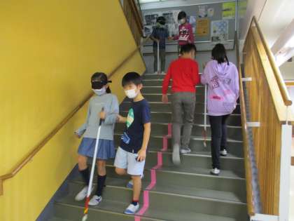 体験後、「目の不自由な人は、自分がどこにいるのか分からなくてこわいんだろうなと思いました。」や「優しくしっかりと声をかけないとだめなんだと分かりました。」等の感想をもちました。また、「点字ブロックがないところでは手をつないで歩いてあげたい。」「白杖をもった人が道に迷っていたら声をかけて力になる。」など心温まる文でワークシートをまとめました。