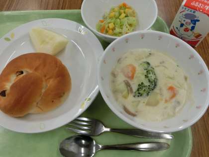 「ぶどうパン、クリームシチュー、コーンサラダ、ラ・フランス、牛乳」です。