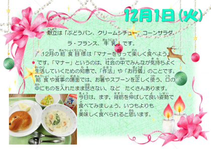 12月最初の給食は、身体が温まりそうな「クリームシチュー」からスタートです。今日は牛乳や乳製品に加え、豆乳も使いました。子どもたちには給食を通していろいろな食材を経験してもらいたいと思っています。