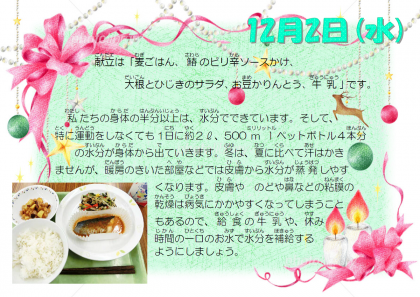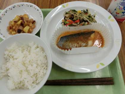 「麦ごはん、鰆のピリ辛ソース、大根とひじきのサラダ、お豆かりんとう、牛乳」です。