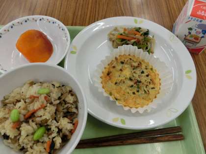 「ひじきごはん、切干大根の卵焼き、青菜のおひたし、柿、牛乳」です。