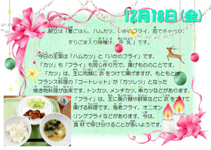 温かい日差しですが、気温はあまり上がっていないようです。今週最後の給食は、揚げ物2種類とすりごまを加えた味噌汁です。