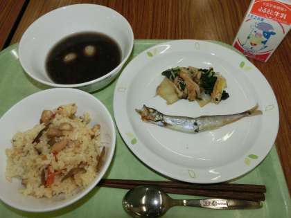 「鶏肉と牛蒡のごはん、焼きししゃも、きのこ入り煮びたし、白玉汁粉、牛乳」です。