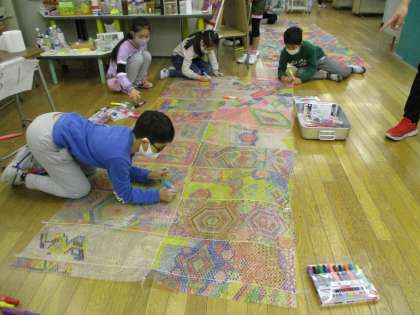 決められたサイズに個々で図柄を考えてぷちぷちシートに色をつけました。友達とつなげて1つの大きな作品にしています。もうすぐ完成です。