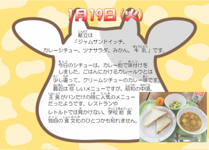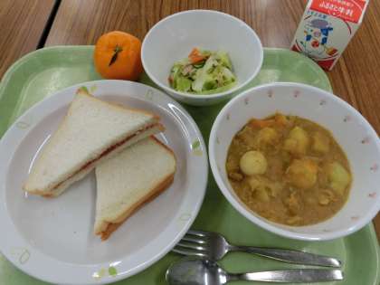 「ジャムサンドイッチ、カレーシチュー、ツナサラダ、みかん、牛乳」です。