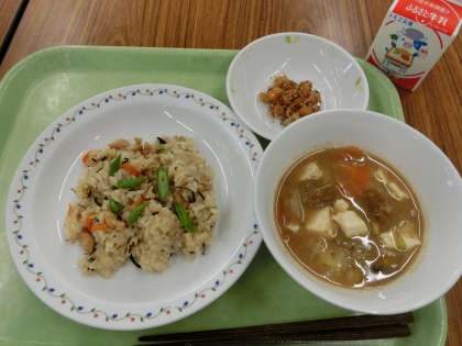 「磯おこわ、鰯のつみれ汁、大豆とじゃこの甘辛揚げ、牛乳」です。