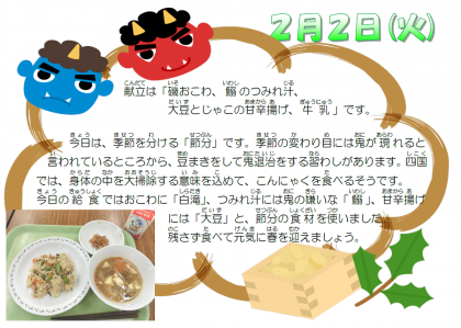 今日は節分メニューです。鰯のつみれ汁は、子どもたちにあまり人気がないのですが、クラスによっては食缶が空になっているところもありました。何でも食べられる大人になってほしいと思います。
