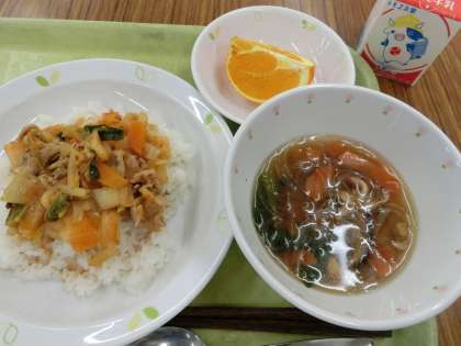 豚キムチ丼は、意外と子どもたちに人気があります。辛さが強くならないよう、白菜やたまねぎ、にんじんなどの野菜をたくさん加えます。