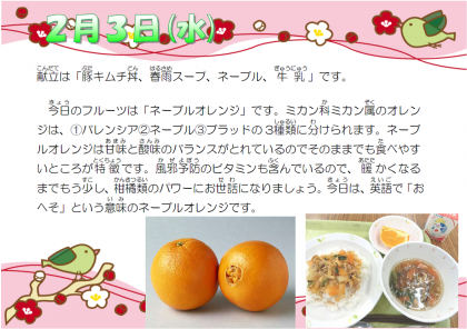 「豚キムチ丼、春雨スープ、ネーブルオレンジ、牛乳」です。