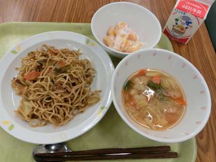 「ソース焼きそば、白いんげん豆の田舎風スープ、ピーチヨーグルト、牛乳」です。