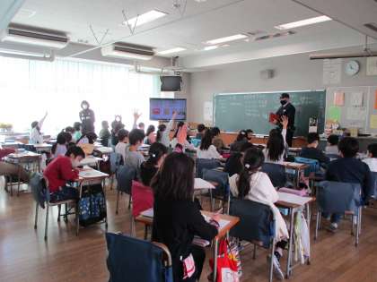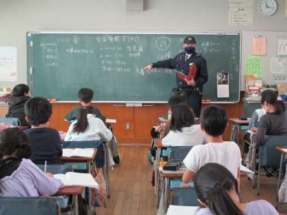 地域の安全を守っている駐在所の武藤さんを講師にお招きしました。映像や黒板を使って警察官のお仕事を丁寧に話して下さいました。お話を聞いたあと子供たちは疑問に思ったことを次々質問し、お仕事に対しての理解を深めていました。