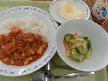 「チリビーンズライス、イタリアンサラダ、りんご、牛乳」です。