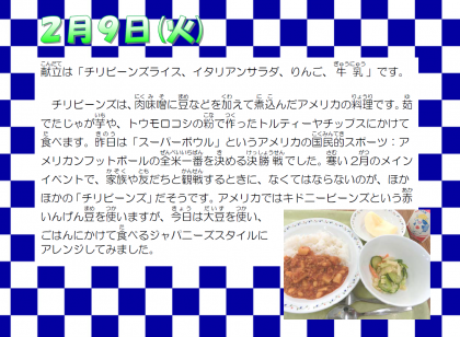 今日は2月のオリパラ給食でした。アメリカのホームパーティーでの定番という「チリビーンズ」を作りました。世田谷区は東京オリンピックで、アメリカ合衆国のホストタウンに登録されています。本場のチリビーンズと食べ比べてみたいです。