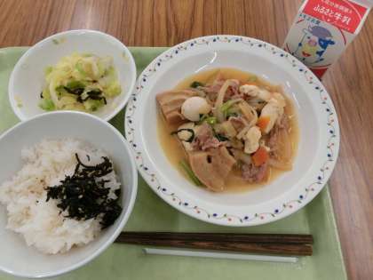 「麦ごはん、ひじきのふりかけ、すき焼き風、キャベツの塩昆布かけ、牛乳」です。