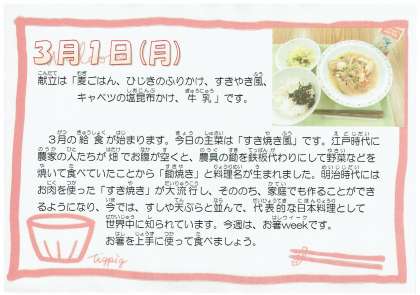 今日から3学期のお箸weekです。いろいろな形の具材を使った「すき焼き風」をお箸だけで食べます。ごはんも、すき焼き風も、スプーンで食べればパクパク食べられますが、お箸を使うことは脳への良い刺激にもなります。今週1週間は、今年度の集大成として、意識してお箸を使うよう伝えています。