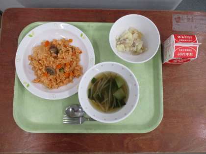 「チキンライス、ジャーマンポテト、野菜スープ、牛乳」です。