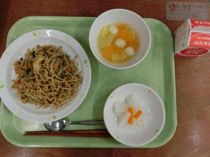 きょうは子どもたちに人気のソース焼きそばとフルーツ白玉です。残菜も少なくよく食べてくれました。