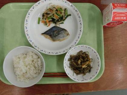 献立は「麦ごはん、鰆の西京焼き、野菜のごまだれかけ、刻み昆布の五目煮、牛乳」です。