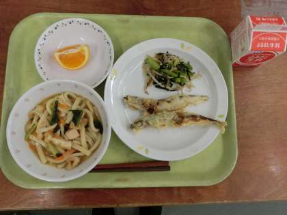 献立は「きつねうどん、天ぷら、こまつなの乾物あえ、清見オレンジ、牛乳」です。