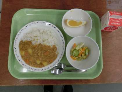 献立は「カレーライス、コーン入りフレンチサラダ、美生柑、牛乳」です。