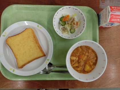 献立は「フレンチトースト、ビーンズシチュー、ツナサラダ、牛乳」です。