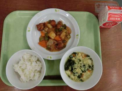 献立は「麦ごはん、酢豚、卵とわかめのスープ、牛乳」です。