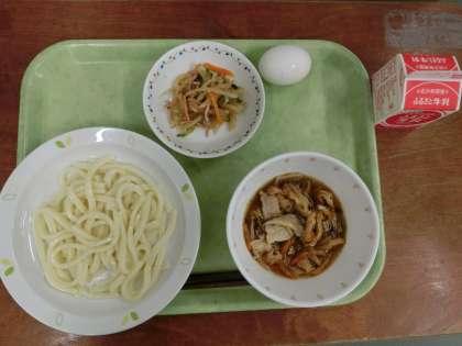 献立は「五目冷やしうどん、ゆで卵、かみかみサラダ、牛乳」です。