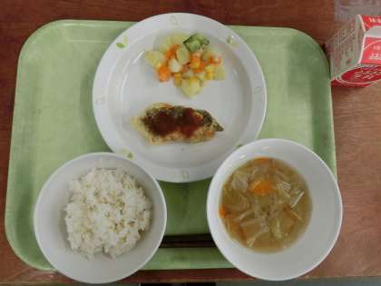 献立は「麦ごはん、魚のバーベキューソース、マセドアンサラダ、野菜スープ、牛乳」です。