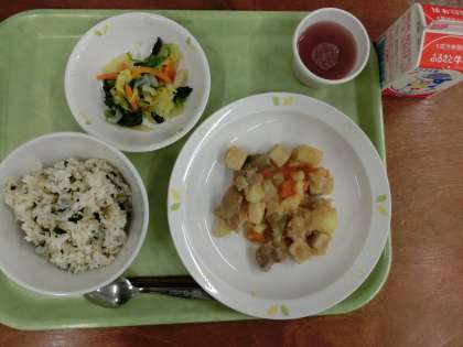 献立は「わかめごはん、五目うま煮、野菜のおかかかけ、ぶどうゼリー、牛乳」です。