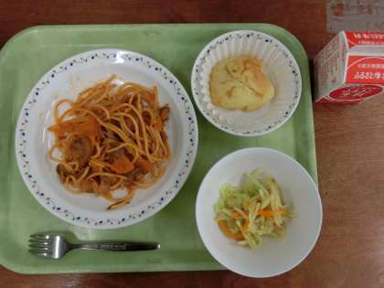 献立は「スパゲッティナポリタン、じゃがいものハニーサラダ、パインケーキ、牛乳」です。