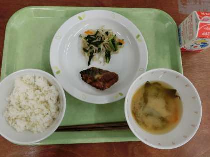 献立は「麦ごはん、魚の南蛮揚げ、おひたし、みそ汁、牛乳」です。