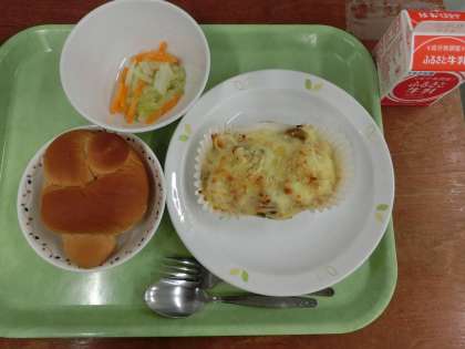 献立は「黒砂糖パン、ポテトグラタン、キャベツサラダ、牛乳)です。
