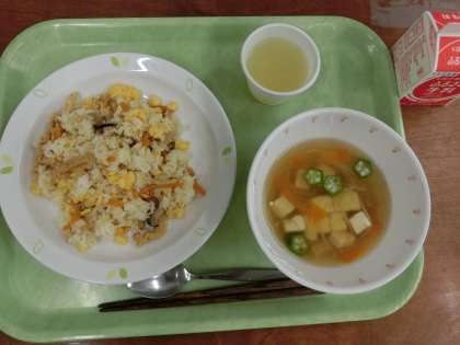 献立は「こぎつねごはん、七夕汁、りんごゼリー、牛乳」です。